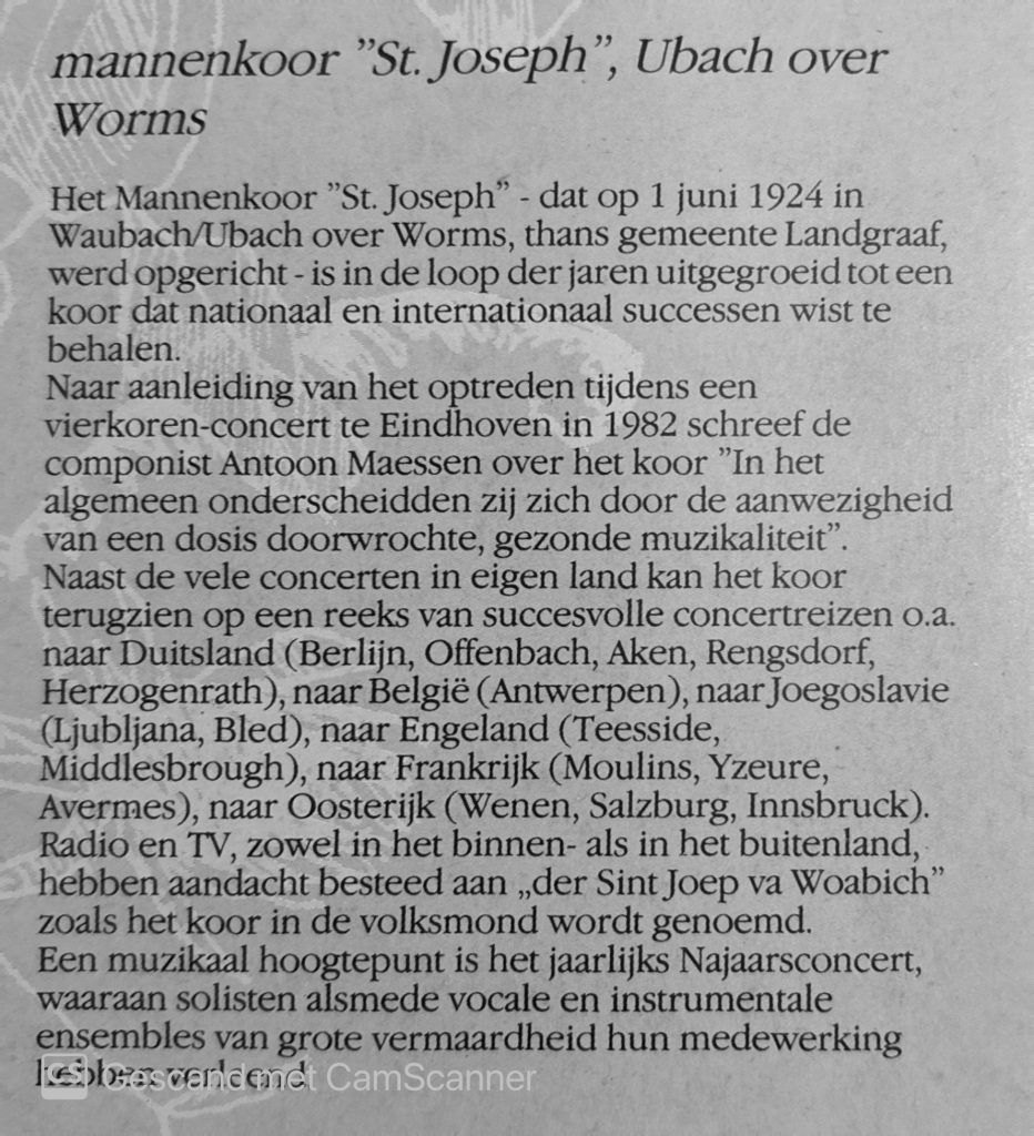 Het betrof de LP die ter ere van het 60-jarig lustrum van het Landgraafs Mannenkoor St.-Joseph, toen onder leiding van Harry Dieteren (de vader van Guido Dieteren). Het was in samenwerking met zangvereniging Orpheus uit Nuth (vierden ook hun eigen lustrum: 40 jaar) en het Landgraafs Symfonie Orkest, beide óók onder leiding van dezelfde Harry Dieteren. De titel van de LP is: ‘Een muzikale “kroedwusj”‘.